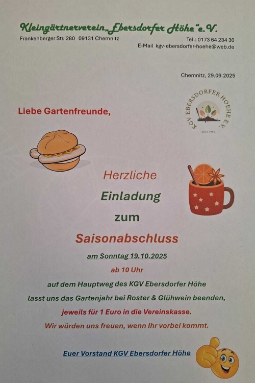 Am 19.10.25 wollen wir uns ab 10 Uhr treffen um die Saison 2025 bei Roster und Glühwein ausklingen zu lassen, alle Vereinsmitglieder sind hierzu herzlich eingeladen , Treffpunkt ist am Hauptweg.